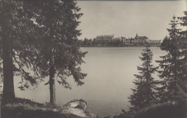 Widok na Szczyrbskie Jezioro. Nad brzegiem jeziora widoczne budynki sanatoryjne i hotelowe. Na pierwszym planie drzewa.