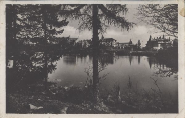 Szczyrbskie Jezioro. Nad brzegiem widoczne zabudowania sanatoryjno hotelowe. Na pierwszym planie drzewa.