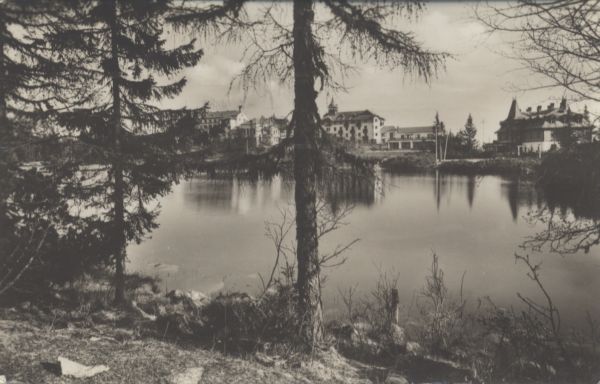 Szczyrbskie Jezioro. Nad brzegiem widoczne zabudowania sanatoryjno hotelowe. Na pierwszym planie drzewa.
