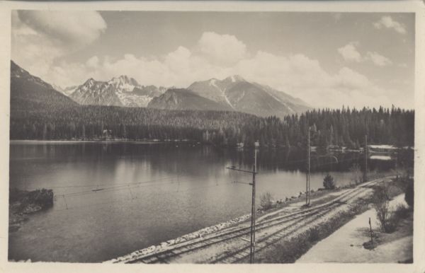 Widok na Szczyrbskie Jezioro. Trasa kolejowa w prawym dolnym rogu pocztówki. Las w tle szczyty: Kopa Popradzka, Wysoka, Osterwa, Tępa i Kończysta.