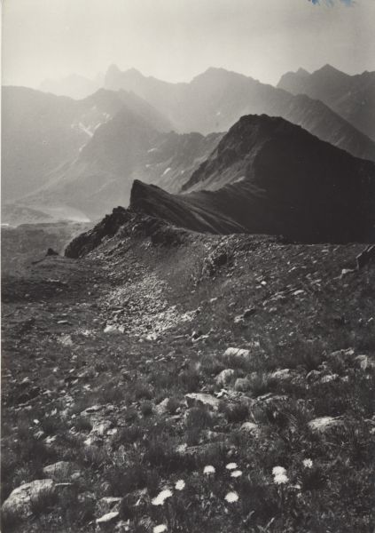 TATRZAŃSKI PARK NARODOWY. Widok z Walentkowego Wierchu na południowy wschód ponad Gładkim Wierchem. Na obrzeżu od lewej Niżnie Rysy, Rysy, Wysoka, Mięguszowieckie Szczyty, Koprowy Wierch i w prawo piramida Szczyrbskiego Szczytu.