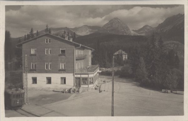Hotel Solisko w Szczyrbskim Jeziorze. Po lewej stronie wagon kolei elektrycznej. W tle Wielkie Solisko.