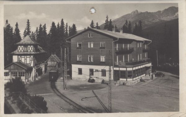 Hotel Solisko w Szczyrbskim Jeziorze. Po lewej stronie stacja Tatrzańskiej Kolej Elektrycznej, przed nią wagony kolejowe. W tle Krywań.