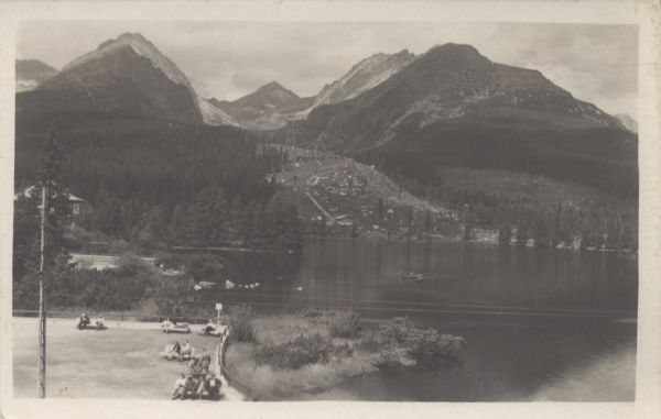 Widok na otoczenie Szczyrbskiego Jeziora. Las, Skocznia narciarska, zabudowania i szczyty, na brzegu jeziora na ławkach siedzą wypoczywający turyści.