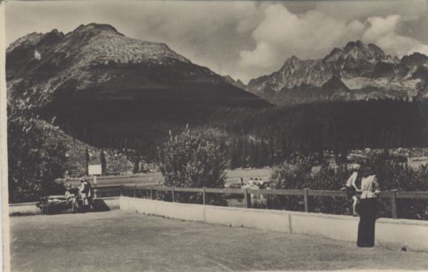 Osada Szczyrbskie Jezioro. Na pierwszym planie turyści. W tle pejzaż ze szczytami: Skrajna Baszta, Kopa Popradzka i Wysoka.