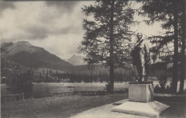 W tle Szczyrbskie Jezioro. Na pierwszym planie skwer i pomnik partyzanta upamiętniający Słowacki Powstanie Narodowe, autorstwa rzeźbiarza Ladislav Snopka.