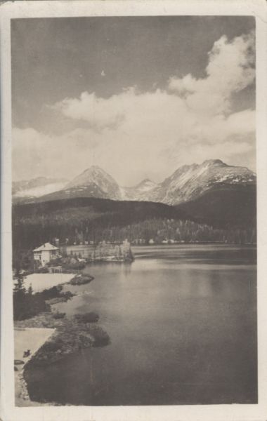 Widok na Szczyrbskie Jezioro. W tle od lewej: Szczyrbskie Solisko, Szczyrbski Szczyt, Skrajna Baszta. Na brzegu jeziora willa Marina.