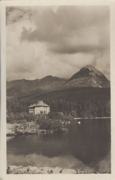 Widok znad Szczyrbskiego Jeziora. Na brzegu jeziora po lewej stronie willa Marina, za nią las. W tle od lewej szczyty: Krótka, Ostra i Szczyrbskie Solisko.