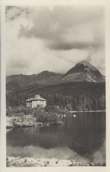 Widok znad Szczyrbskiego Jeziora. Na brzegu jeziora po lewej stronie willa Marina, za ni± las. W tle od lewej szczyty: Krótka, Ostra i Szczyrbskie Solisko.
