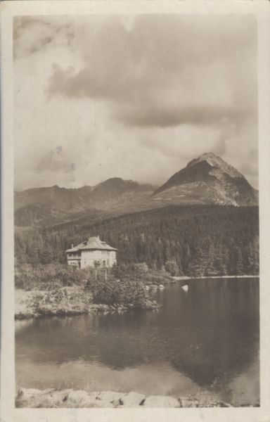 Widok znad Szczyrbskiego Jeziora. Na brzegu jeziora po lewej stronie willa Marina, za nią las. W tle od lewej szczyty: Krótka, Ostra i Szczyrbskie Solisko.