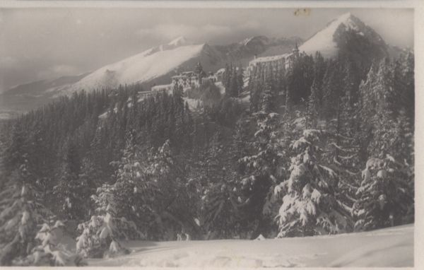 Zimowy widok na Szczyrbskie Jezioro. Zabudowania sanatoryjne w tle. Ośnieżony las na pierwszym planie. W tle widok na szczyty: Krywań, Siodełkowa Kopa, Ostra, Solisko.