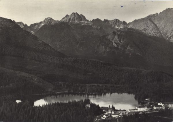 Widok na panoramę Wysokiej i Szczyrbskie Jezioro. U dołu po prawej widać zabudowania nad stawem w miejscowości Szczyrbskie Jezioro.