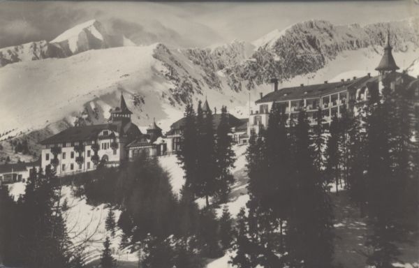 Widok na osadę Szczyrbskie Jezioro w zimowej scenerii. Zabudowania sanatoryjne. W tle Krywań, Siodełkowa Kopa i Ostra.