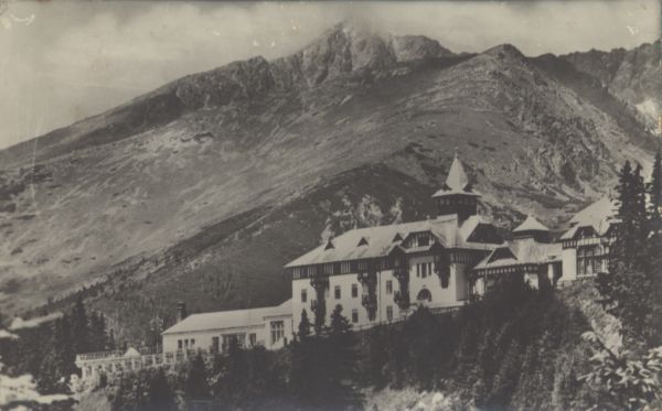 Widok na osadę Szczyrbskie Jezioro. Zabudowania sanatoryjne. W tle Krywań i Siodełkowa Kopa.