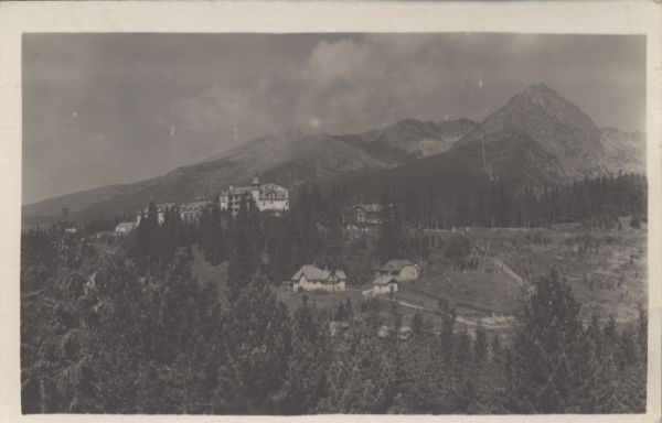Widok na osadę Szczyrbskie Jezioro. W¶ród drzew widoczne budynki sanatoryjno hotelowe. W tle Szczyrbskie Solisko.