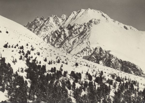 TATRY WYSOKIE - widok od zachodu na grań Kończystej, po lewej Mała Kończysta, po prawej u dołu skalne zerwy Osterwy. Tytuł również w języku: ros., niem., ang.