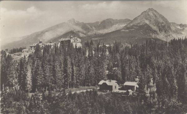 Pocztówka bez obiegu pocztowego, czysta. Logo wydawcy. Zaklejony tytuł pocztówki. Na naklejonym pasku papieru napis - ©trbské pleso.