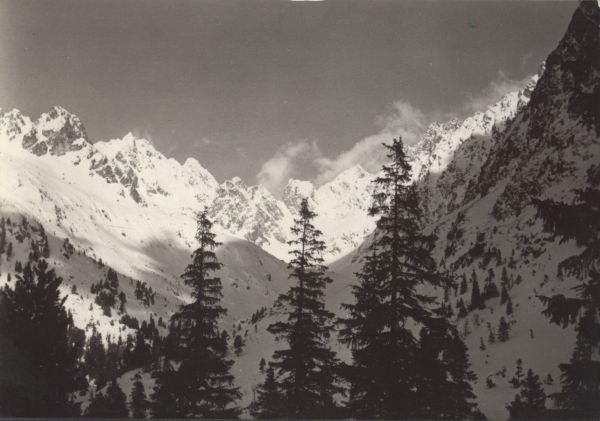 Zimowy widok znad Popradzkiego Stawu do Doliny Złomisk. W tle od lewej widać Złomiska Turnię, Żłobisty Szczyt, Żelazne Wrota i Zmarzły Szczyt.