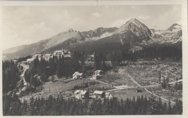 Widok na osadę Szczyrbskie Jezioro. W¶ród drzew widoczne budynki sanatoryjno hotelowe. W tle Krywań, Solisko, Szczyrbski Szczyt.