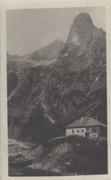 Tatry Wysokie - Schronisko przy Zielonym Stawie Kieżmarskim i Jastrzębia Turnia. Tytuł również w języku: niem., węg.