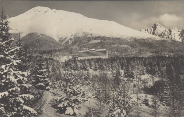 Nowy Smokowiec w zimowej scenerii. W tle Sławkowski Szczyt, z prawej Łomnica.