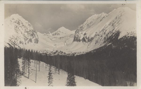 Widok na Dolinę Młynick± w zimie. Od lewej: Szczyrbskie Solisko, Szczyrbski Szczyt, Szatan, Skrajna Baszta.