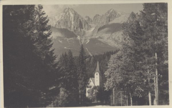 Widok z Tatrzańskiej Łomnicy na Łomnicę, Widły i Kieżmarski Szczyt. Na pierwszym planie kościół ewangelicki.