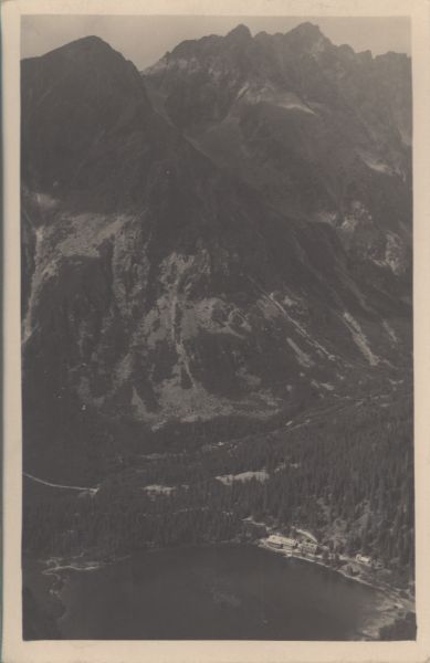 Widok na Popradzki Staw i Dolinę Mięguszowiecką z Osterwy. Na pierwszym planie Popradzki Staw, nad jego brzegiem schronisko turystyczne otoczone lasem. W tle Mała Baszta, Pośrednia Baszta, Szatan i Zadnia Baszta.