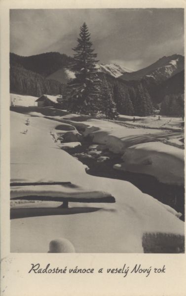Zimowy pejzaż z Jaworzyny Spiskiej. Na pierwszym planie potok, w tle szałas, las i szczyty. Pod zdjęciem życzenia: Radostné vánoce a veselý Nový rok.