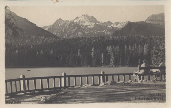 Widok z nadbrzeża na Szczyrbskie Jezioro, las i panoramę Tatr z Wysoką. Na pierwszym planie na ławeczce dwie turystki. Na dole wpisany tytuł i nazwisko fotografa.
