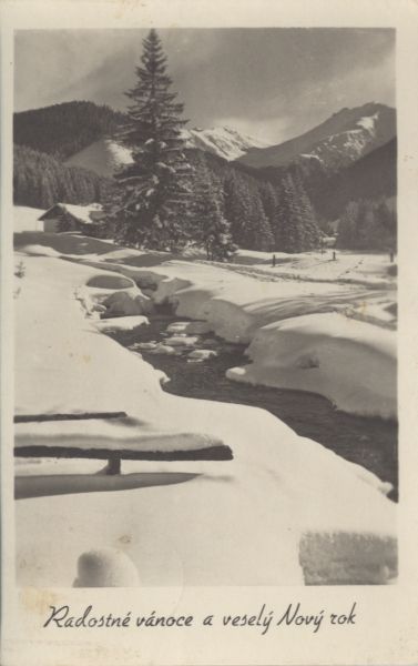 Zimowy pejzaż z Jaworzyny Spiskiej. Na pierwszym planie potok, w tle szałas, las i szczyty. Pod zdjęciem życzenia: Radostné vánoce a veselý Nový rok.