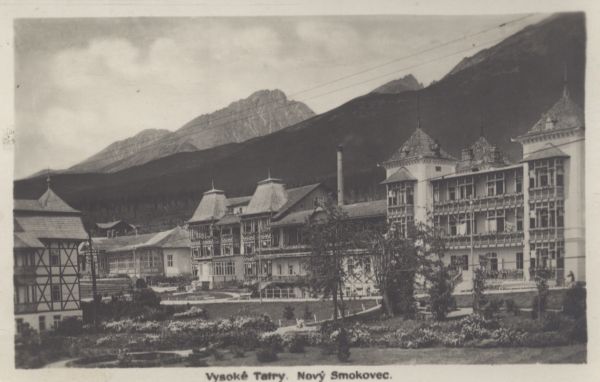 Widok na osadę Nowy Smokowiec. Widoczne zabudowania sanatoryjno hotelowe. W tle las i szczyty. Pod zdjęciem tytuł.