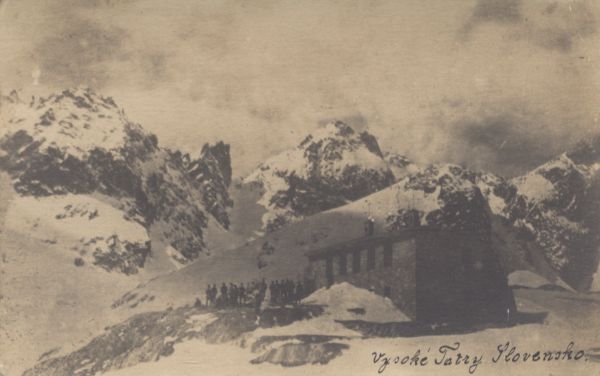 Widok na schronisko Térego w Dolinie Małej Zimnej Wody i otaczające je szczyty w zimie. Od lewej: Sokola Turnia, Spąga, Czerwona Ławka, Mały Lodowy Szczyt. Z przodu Pięciostawiańska Kopa. Przed schroniskiem stoi grupa turystów. Na dole wpisany tytuł.
