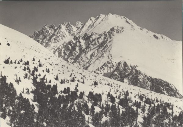 Tatry Wysokie - Widok od zachodu na grań Kończystej. Z lewej: Mała Kończysta, z prawej skaliste zerwy Osterwy. Tytuł również w języku: ros., niem., ang.