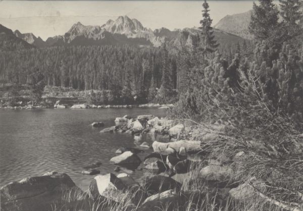 Widok na Wysok± znad Szczyrbskiego Jeziora. Na pierwszym planie brzeg jeziora z głazami w wodzie i kosodrzewin± (Pinus mugo Turra) na brzegu. W głębi las. W tle od lewej szczyty: Żabi Koń, Kopa Popradzka, Wysoka i Osterwa (z przodu po prawej stronie).