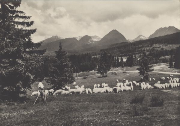 Widok ze Szczyrbskich ł±k na: Krywań, Krótk±, Ostr±, Szczyrbskie Solisko, Sczyrbski Szczyt i Grań Baszt. Na pierwszym planie pas±ce się owce i juhas.