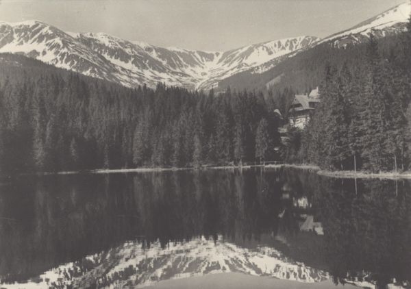 Niżne Tatry - Jasna. Wrbicki Staw, w którym odbijają się góry. Na brzegu schronisko Mikołaja. W tyle Bory.