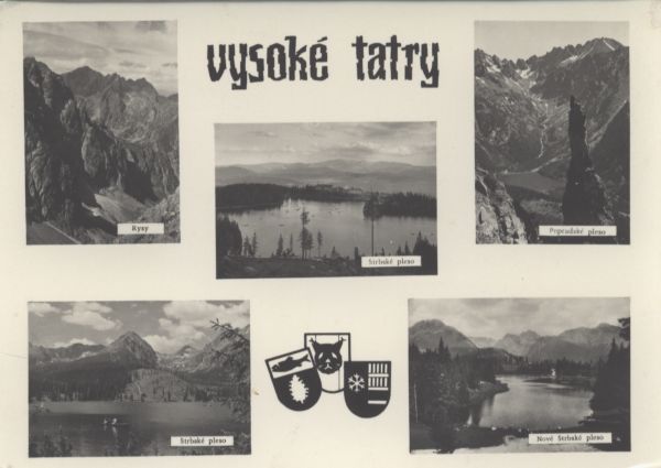 Widok na Nowe Szczyrbskie Jezioro, w tle Wysoka. W górnej części pocztówki napis: vysoké tatry, a w dolnej herby 3 miejscowości.