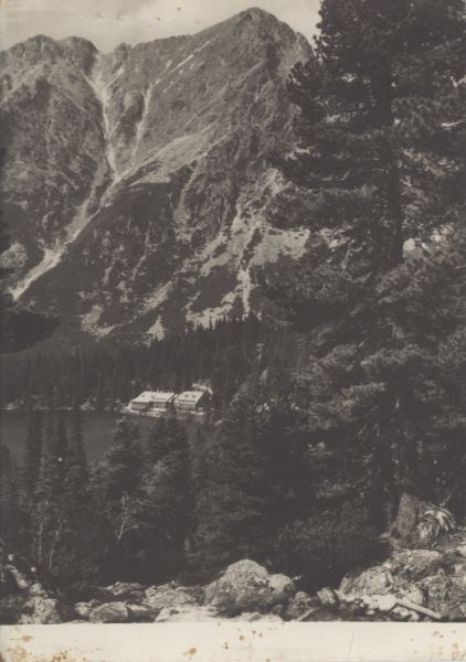 Schronisko nad Popradzkim Stawem. W tle Pośrednia Baszta. Na pierwszym planie limba (Pinus cembra L.).