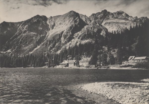 Widok na schronisko nad Popradzkim Stawem. W tle: Skrajna Baszta, Mała Baszta, Pośrednia Baszta, Szatan.