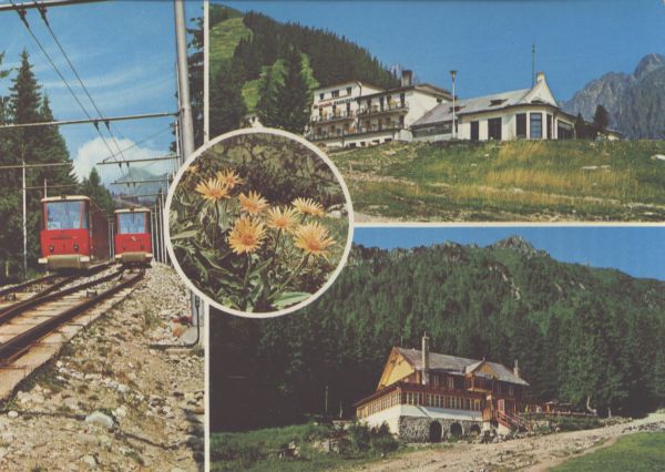 VYSOKÉ TATRY - VYSOKIE TATRY - HOHE TATRA - THE HIGH TATRAS Starý Smokovec. Pozemná lanovka na trati Starý Smokovec - Hrebienok. Zotavovňna ROH "Hrebienok". Kamzičnica Clusiova (Doronicum clusii). Chata Kamzík (1295 m)