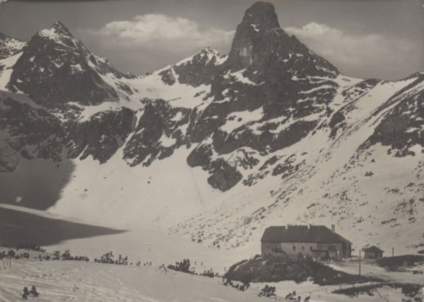 Widok na schronisko przy Zielonym Stawie Kieżmarskim w scenerii zimowej. Przed schroniskiem grupa turystów. W tle Baranie Rogi, Czarny Szczyt, Kołowy Szczyt i Jastrzębia Turnia.