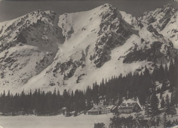 Widok na Popradzki Staw w scenerii zimowej. Na pierwszym planie zamarznięte jezioro oraz schronisko otoczone lasem. W prawym dolnym rogu kosodrzewina (Pinus mugo Turra). W tle szczyty: Pośrednia Baszta, Zadnia Baszta i Szatan.