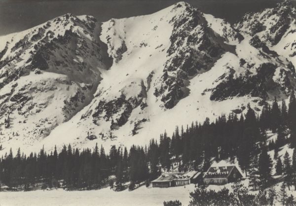 Widok na Popradzki Staw w scenerii zimowej. Na pierwszym planie zamarznięte jezioro oraz schronisko otoczone lasem. W prawym dolnym rogu kosodrzewina (Pinus mugo Turra). W tle szczyty: Pośrednia Baszta, Zadnia Baszta i Szatan.