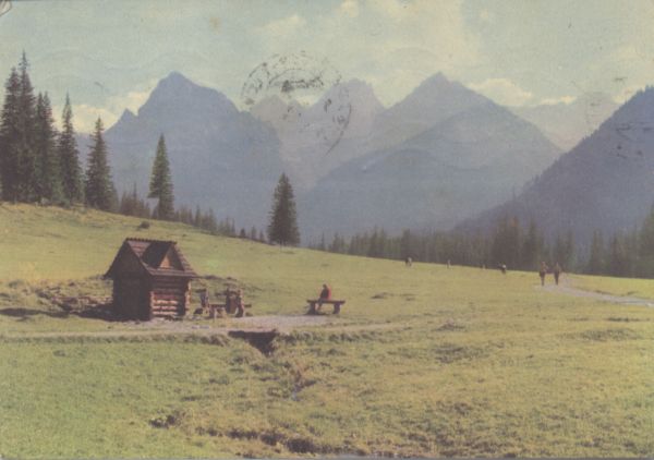 Źródło przy szlaku na Polanie Biała Woda. W tle Młynarz, Rysy i Żabia Czuba.