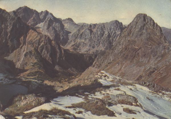 Tatrzański Park Narodowy [Słowacja] - Od lewej: Rysy, Niżnie Rysy, Wyżni Żabi Szczyt, Młynarz i Hruba Turnia. Tytuł również w języku: ros., ang., niem.