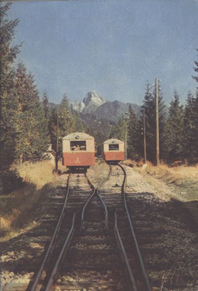 Wagony kolei linowo-terenowej ze Starego Smokowca na Siodełko w czasie mijania siê. W tle szczyt Łomnicy.