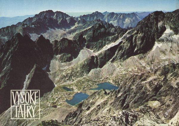 Widok z Łomnicy ponad Dolinę Pięciu Stawów Spiskich ze schroniskiem Téryego. W tle z lewej Gerlach, przed nim Po¶rednia Grań z Żółt± ¦cian±, z prawej Lodowa Kopa. Na dole napis: VYSOKÉ TATRY.