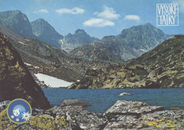 Dolina Staroleśna. Widok znad Długiego Stawu na Baniastą Turnię, Małą Wysoką, Rohatkę, Dziką Turnię i Świstowy Szczyt. Po lewej stronie schronisko Zbójnickie. W lewym dolnym rogu logo miasta VYSOKÉ TATRY, po prawej stronie u góry napis: VYSOKÉ TATRY.