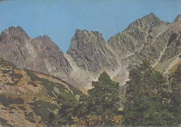 Tatry Wysokie. Dolina Złomisk, odnoga Mięguszowieckiej Doliny nad Popradzkim Stawem z rzadką roślinnością sosną limbą. Tytuł również w języku: niem, ang., fr.